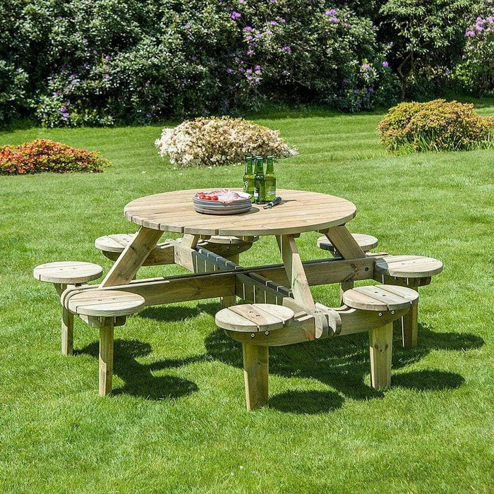 The Alexander Rose Pine Gleneagles Round Wooden Picnic Table 1.88m is a chunky style picnic table completed with 8 adjoining stools solidly constructed from treated sustainable pine. An excellent choice for making the most of a garden party and dining alfresco with family and friends. Pine is the ideal softwood for creating garden furniture that is both strong and practical. It has an impressive grain and its yellow green colour mellows over time to an attractive silver grey.