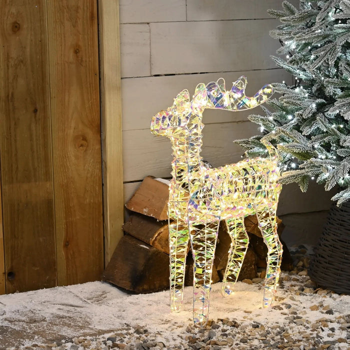 Create a winter wonderland this year with this light up iridescent Christmas Reindeer decoration. Ideal for placement anywhere within your indoor space on a display cabinet or by the front door to wow any visitors to your home this Christmas. At 60cm tall, this mesmerising Reindeer is the perfect addition to any festive décor. With a white metal frame and a stunning iridescent foil, the Reindeer has 720 pin wire multi-function LED lights woven around the frame to bring a warm and enchanting glow for an eye catching piece. This Reindeer decoration is free standing and mains powered with a generous 5 meter clear cable from product to plug. Suitable for indoor use only.
