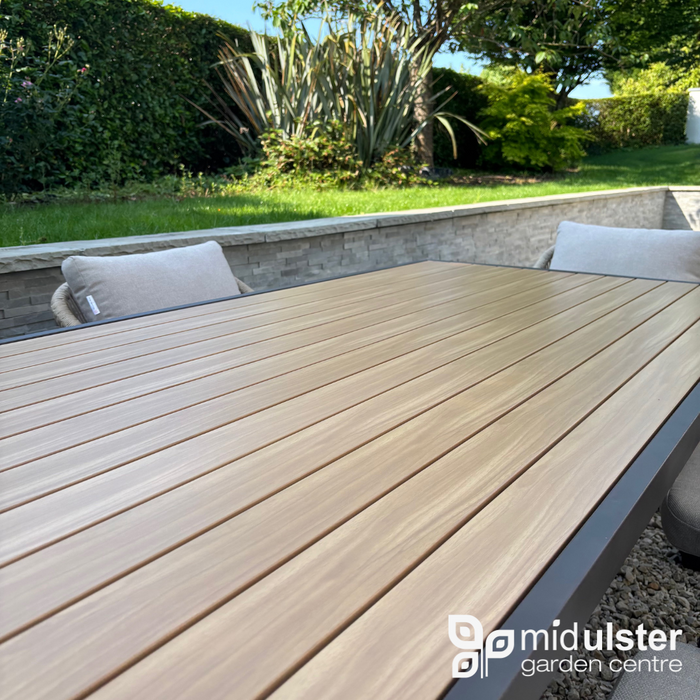 A sophisticated large rectangular dining table with a teak-look aluminum top, offering the beauty of natural wood with superior weather resistance and minimal maintenance. The table's robust aluminum frame ensures lasting durability while maintaining a sleek, modern profile.