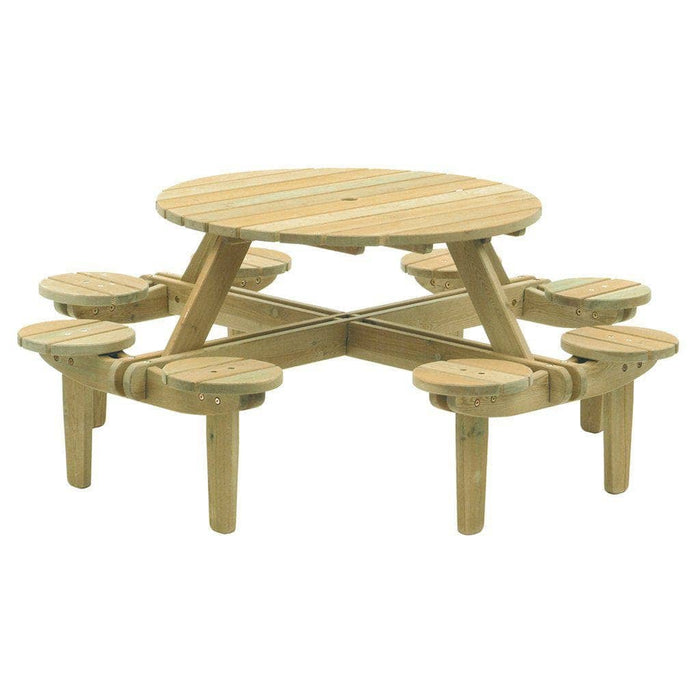 The Alexander Rose Pine Gleneagles Round Wooden Picnic Table 1.88m is a chunky style picnic table completed with 8 adjoining stools solidly constructed from treated sustainable pine. An excellent choice for making the most of a garden party and dining alfresco with family and friends. Pine is the ideal softwood for creating garden furniture that is both strong and practical. It has an impressive grain and its yellow green colour mellows over time to an attractive silver grey.