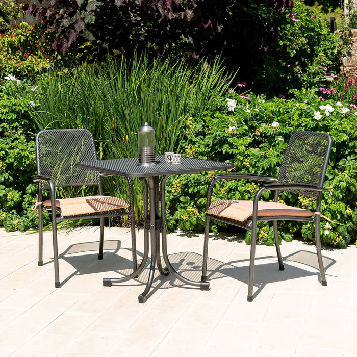 The Alexander Rose Portofino Tea for Two Set with Armchairs is a charming garden or patio set. Its small size makes it ideal if space is at a premium such as on a balcony or small patio. The contemporary Portofino range is made from fine powder coated, tubular steel & wire mesh. The mesh is fused to the frame with great precision producing a soft blend between the two materials.