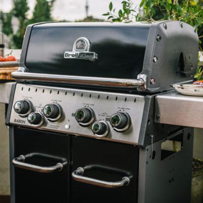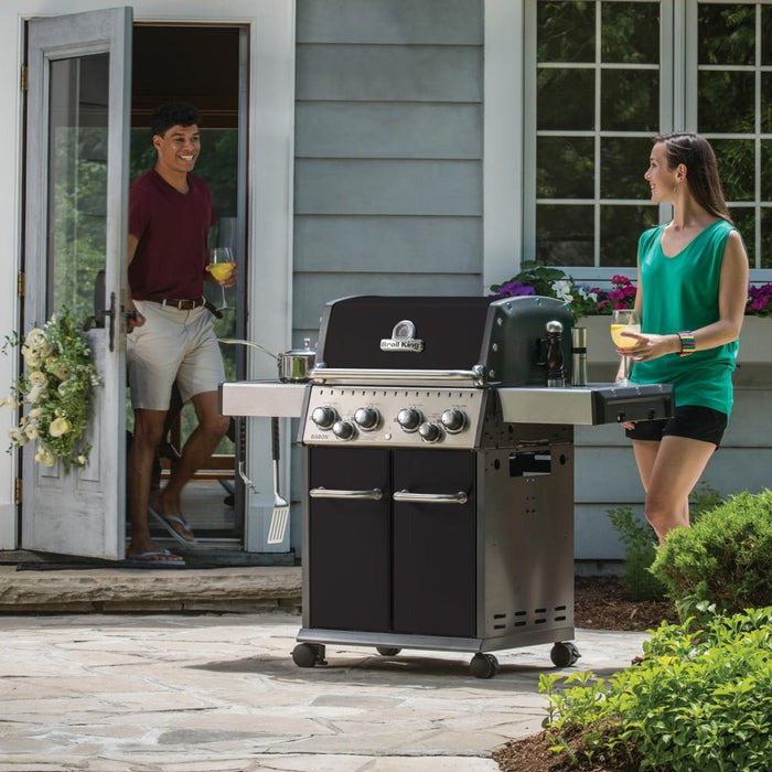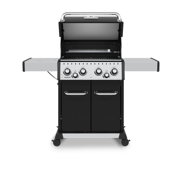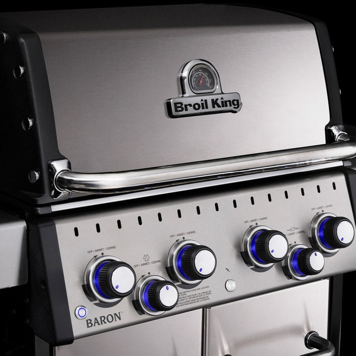 The Broil King Baron 490 IR is a premium gas barbecue that combines power, versatility, and style. Its sleek black porcelain-coated hood houses four stainless-steel main burners delivering 12.4 kW (42,000 BTU) of cooking power.