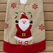 Santa Design: Features a jolly Santa Claus with his arms raised in celebration on natural burlap with red felt border. Complete with his classic red suit, white beard, black belt with golden buckle, and striped red and white stockings.