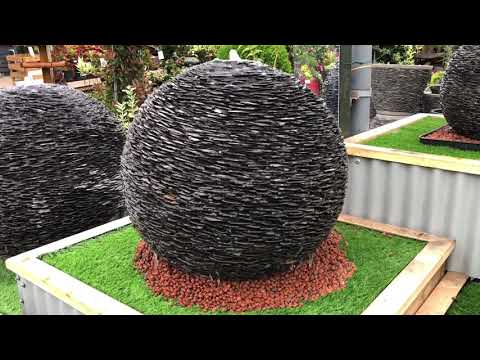 The slate sphere's are commonly be situated at ground level with the reservoir buried or partially buried below. The reservoir collects the water below the water feature as it flows off the sphere. The pump in the reservoir pumps the water back out of the top of the feature so it is recycled.