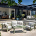 The two-seat sofa and matching lounge chairs feature generously padded cushions upholstered in premium, textured fabricthat offers both plush comfort and durability. The subtle weather resistant rope detailing on the seat backs adds a tactile charm and visual depth to the design.