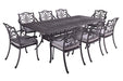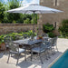 - Set includes: 1 x Rectangular Dining Table, 8 x Dining Chairs, 3m Round Traditional Parasol (UPF50+ Certified) and 15kg Concrete Base (not suitable on some composite decking - check with your manufacturer)