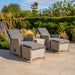 Each chair includes an adjustable reclining back, allowing you to sit upright for conversation or lean back when it's time to truly relax. The two matching stools provide added comfort as footrests or additional seating when guests join you. A coordinating side table with an eco-wood slatted top completes the set, giving you the ideal spot for drinks, books, or morning coffee.