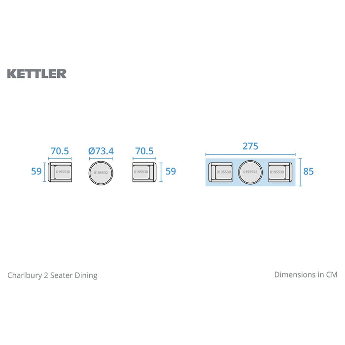 The Kettler Cassis Duo set is perfect for a balcony or small garden to relax in the sun or read a book. The set includes 2 x Cassis lounge chairs and side table. Made from an aluminium frame and the lounge chairs have a PVC rope weave and the side table has a grey finish glass top. Can be left outdoors all year round (excluding cushions).