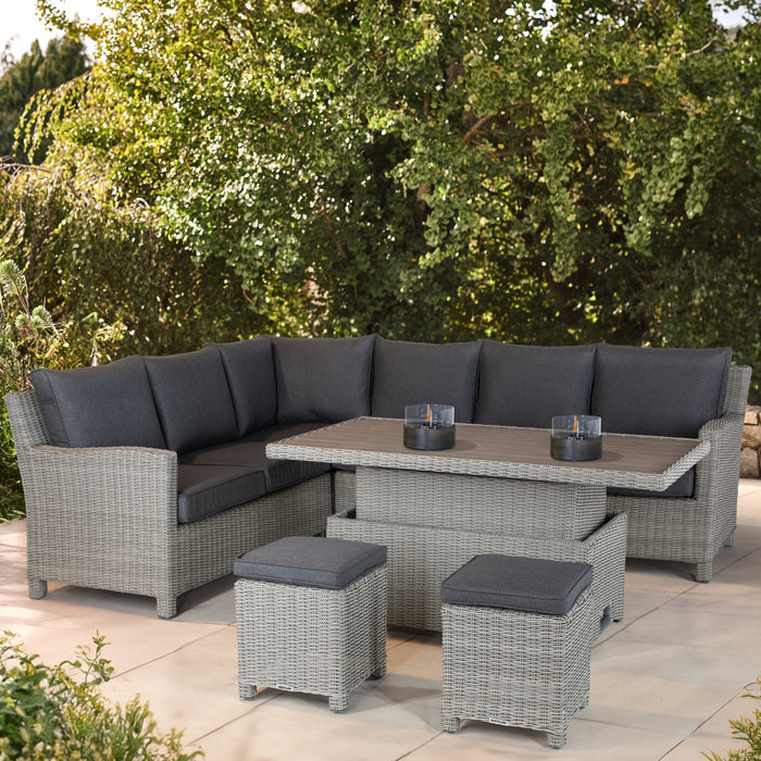 The Kettler Palma Signature Corner Seating Right Sided in White Wash (choice of table) is a modern set to fit that perfect space whether it be in a conservatory or on a patio. Should you consider a lounge or dining set? if you don't have the space or budget for two sets, you don't have to choose. This versatile casual dining set gives you the best of both worlds with the comfort and aesthetics to match.
