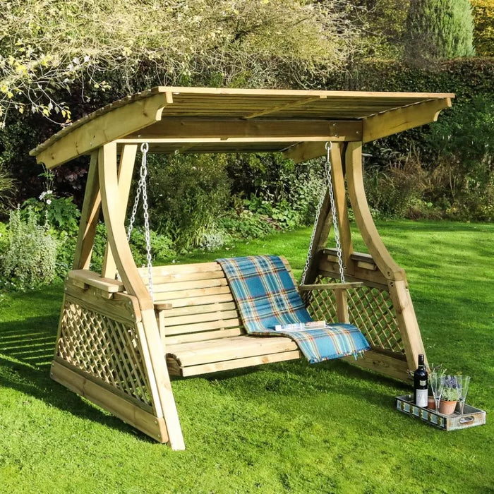 The Santorini Swing Seat prioritizes comfort, with a thoughtfully designed ergonomic seat. Its 120cm wide and 49cm deep seating area comfortably fits two people. The curved laminated supports not only give it a stunning look, but also provide an unobstructed view of the garden, a unique feature among swings. The design also includes diamond trellis panels and a new canopy shape, making it a gorgeous focal point for any garden. Constructed from pressure treated PEFC timber, this swing is built to last and bring years of enjoyment.
